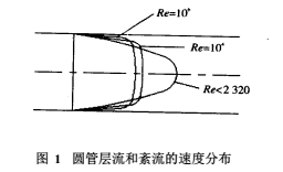 不同流動狀態(tài)的水泥漿液流經流量計測量管時,管內圓截面上會呈現不同的流速分布(見圖1),即: 層流的流速變化是拋物線分布,在管中心軸上流速*大,且雷諾數變化、流速分布形態(tài)不變;紊流時,流速分布在測量管內壁的近旁比層流流速大,在中心部比層流時流速小,且流速分布形態(tài)隨雷諾數的變化而變化。