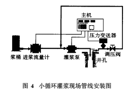 小循環(huán)灌漿法的實質是: a泵的吸入量主要由返漿量提供,返漿量的大小由高壓調節(jié)閥控制,鉆孔灌漿注入量=流量計量(見圖4);b流量計大部分時間工作在1/3量程之下,相當長的時間內工作在1L/min左右;c返漿漿液不返回攪漿桶,水泥漿液只能在閉合的管道中循環(huán),漿桶內調節(jié)水灰比對灌漿漿液的密度影響甚微。