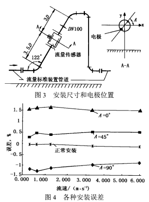 除儀表前直管段可降低彎管影響外,人們還從安裝方式上設(shè)法降低影響的方法。文獻(xiàn)曾報(bào)道電磁流量傳感器電極軸線與鄰近彎管平面成45°傾斜安裝可以減少彎管影響。日本工業(yè)標(biāo)準(zhǔn)B7554“解說部分”列有電極軸線與彎管平面垂直、平行、成45°三種安裝方式,在不同長度直管下的測量誤差范圍,也說明這一效果。
