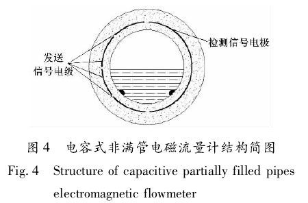 ②電容式非滿管生活污水流量計h。電容式非滿管生活污水流量計結(jié)構(gòu)簡圖如圖4所示。、檢測信號電極 發(fā)送信號電