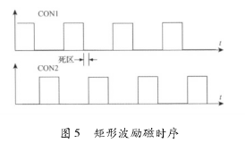 該電路主要由勵(lì)磁時(shí)序發(fā)生單元、三態(tài)緩沖器及隔離光耦組成。勵(lì)磁時(shí)序由dn65污水流量計(jì)系統(tǒng)的控制核心產(chǎn)生。采用DSP的EPWM外設(shè)模塊,通過(guò)設(shè)定其內(nèi)部定時(shí)器的工作模式發(fā)出所要求的勵(lì)磁頻率的勵(lì)磁時(shí)序PWM信號(hào)CT_1和CT_2。由于勵(lì)磁控制系統(tǒng)中的勵(lì)磁工作電源的電壓要比DSP的工作電源電壓高得多,為防止勵(lì)磁電路故障對(duì)系統(tǒng)控制核心產(chǎn)生致命影響,采用光耦將控制部分與勵(lì)磁部分進(jìn)行隔離。另外,由于DSP引腳的驅(qū)動(dòng)能力有限,所以在DSP與隔離光耦之間加入三態(tài)緩沖器以驅(qū)動(dòng)隔離光耦的輸入級(jí)。并且,DSP能夠通過(guò)GPIO口控制三態(tài)緩沖器上的使能引腳來(lái)使能和禁止勵(lì)磁,以在檢測(cè)到電路故障時(shí)迅速關(guān)斷H橋所有橋臂。該勵(lì)磁時(shí)序產(chǎn)生電路通過(guò)軟件編程可產(chǎn)生如圖5所示的單頻矩形波。在實(shí)際應(yīng)用中,由于組成H橋的達(dá)林頓三極管與MOS管導(dǎo)通與關(guān)斷的時(shí)間不一致,易在勵(lì)磁方向切換瞬間,產(chǎn)生上下橋臂同時(shí)導(dǎo)通的現(xiàn)象,反映在勵(lì)磁電流波形上為一幅值很高的窄脈沖。該脈沖電流不僅容易引起遲滯比較電路的誤輸出,從而導(dǎo)致高低壓切換電路與電流旁路電路的誤動(dòng)作,而且對(duì)恒流控制電路產(chǎn)生沖擊,減小三端穩(wěn)壓芯片的使用壽命,同時(shí)還會(huì)產(chǎn)生EMC電磁干擾,給測(cè)量精度帶來(lái)影響。所以實(shí)際應(yīng)用時(shí),如圖5所示對(duì)方波勵(lì)磁時(shí)序添加死區(qū),可以明顯減小上述現(xiàn)象。