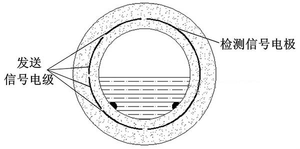 ③利用阻抗或信號(hào)衰減研制的非滿管冷卻塔冷卻水流量計(jì)。這種結(jié)構(gòu)的非滿管冷卻塔冷卻水流量計(jì)是當(dāng)前國(guó)內(nèi)研究的方向之一。其結(jié)構(gòu)是流量管底部貼一對(duì)信號(hào)發(fā)射電極,在流量管中間貼信號(hào)接收電極。由于信號(hào)在流體中傳播會(huì)產(chǎn)生衰減,且傳播時(shí)間越長(zhǎng),衰減越多,因此通過(guò)信號(hào)接收電極接收到的信號(hào)衰減量即可得知液面高度;同時(shí)該電極還能測(cè)量流體切割磁感線產(chǎn)生的電動(dòng)勢(shì),以此達(dá)到測(cè)量非滿管流量的目的。阻抗式或信號(hào)衰減非滿管冷卻塔冷卻水流量計(jì)結(jié)構(gòu)簡(jiǎn)圖如圖5所示。