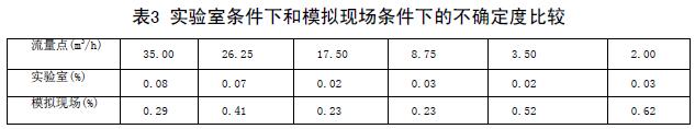實(shí)驗(yàn)室條件下和模擬現(xiàn)場(chǎng)條件下的不確定度比較(表3)兩次結(jié)果可以看出,兩次實(shí)驗(yàn)各個(gè)流量點(diǎn)的不確定度差距非常大??梢?,化工污水流量計(jì)對(duì)安裝條件還是比較苛刻的。