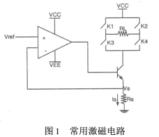 以往的激磁電路的設計都是采用恒流源和可控開關電路組成。恒流源是由電壓基準、比較放大、控制調(diào)整和采樣等部分組成的直流負反饋自動調(diào)節(jié)系統(tǒng),常用的激磁電路就是用串聯(lián)調(diào)整型恒流電源盒控制開關組成的,如圖1。其中Vref是參考電壓,Rs是采樣電阻,Is為流過Rs的電流,就是所需的恒流,RL為電磁流量傳感器線圈,K1、K2、K3、K4為可控開關,以達到使線圈RL中流經(jīng)正負交換的電流,對傳感器激磁。
