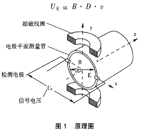 產(chǎn)生與流量成比例的感應(yīng)電勢(shì),流體中產(chǎn)生的感應(yīng)電動(dòng)勢(shì)被位于管子徑向兩端的一對(duì)電極拾取,該信號(hào)電壓uE與磁場(chǎng)強(qiáng)度B、電極間距離D和平均流速穢成正比。磁場(chǎng)強(qiáng)度B和電極距離D是常數(shù),所以信號(hào)電壓與平均流速口成正比。計(jì)算公式如下: