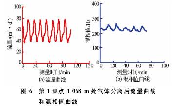 B2-××-××2井是大慶油田采油一廠1口水驅(qū)產(chǎn)出井,該井井口計量產(chǎn)液51.72m3/d,取樣化驗含水率81.8%。采用阻抗式含水率計在該井進行了測試,圖5為*1測點深度1068m測量的流量及混相值曲線圖。圖5的流量曲線表明,流量曲線受氣體影響較大,測量流量波動較大,在25~98m3/d之間波動,平均值為58.6m3/d;混相值波動也很大,在280~640Hz之間劇烈波動,平均值圖5*1測點1068m處流量曲線和混相值曲線388Hz。該井測量流量為65.8m3/d,測量含水為51.3%,受井下產(chǎn)氣影響明顯,測量流量明顯高于井口計量流量,測量含水率明顯低于化驗含水率。同時,在該井測井時,使用了儀器上裝有氣體分離器的阻抗式含水率計在該井進行測試,*1測點的流量及混相值曲線見圖6。由于氣體分離器將氣體分離,未進入測量通道,減小了氣體對測量傳感器的影響,測量的流量及混相值曲線波動明顯減少,流量波動為36~78m3/d,平均值為55m3/d;混相值波動為211~288Hz,平均值為228Hz。測量流量為54.8m3/d,測量含水率為80.4%,與井口計量非常接近。對比測量結果表明,氣體對流量及含水率測量造成了非常大的測量誤差,已不能進行準確測量。