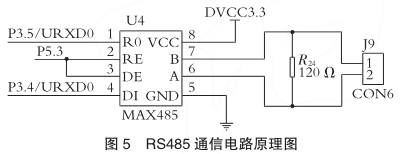 RS485接口組成半雙工網(wǎng)絡(luò),選擇兩線制與上位機電腦相連,采用屏蔽雙絞線傳輸。通信系統(tǒng)整體為總線式結(jié)構(gòu),這樣1臺上位機*多可以和現(xiàn)場32臺智能儀表相連。采用MAX485芯片完成電壓轉(zhuǎn)換,圖5為RS485通信電路原理圖。