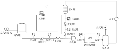 空氣壓縮機(jī)將空氣壓縮后送入儲(chǔ)氣罐,標(biāo)準(zhǔn)流量計(jì)1計(jì)量氣液混合前儲(chǔ)氣罐送入管道的氣體流量。蓄水罐距離地面30m,提供試驗(yàn)所需的液相,其流量由標(biāo)準(zhǔn)流量計(jì)2測(cè)得。液相和氣相經(jīng)混和器混和后送入試驗(yàn)管段,*后流入分離罐將水和空氣進(jìn)行分離,空氣由放氣閥排出,水由水泵送回蓄水罐循環(huán)使用。工控機(jī)對(duì)所有儀表數(shù)據(jù)進(jìn)行采集和顯示并對(duì)兩個(gè)電動(dòng)調(diào)節(jié)閥進(jìn)行控制,調(diào)節(jié)氣相和液相的流量。