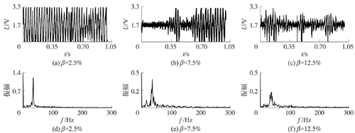 試驗(yàn)發(fā)現(xiàn),氣相的加入對(duì)過(guò)熱蒸汽流量計(jì)測(cè)量的影響顯著,譜分析和脈沖計(jì)數(shù)兩種方法隨著氣相注入的增加其表現(xiàn)也不同。圖4反映了水流量12m3/h時(shí),注入不同氣含率β時(shí)A點(diǎn)的模擬信號(hào),如圖4(a~c)所示;經(jīng)譜分析后得到的頻率值,如圖4(d~f)所示;用脈沖計(jì)數(shù)方法得到的脈沖信號(hào),如圖4(g~i)所示。圖4顯示,當(dāng)注入氣量不大時(shí),對(duì)過(guò)熱蒸汽流量計(jì)的影響不大,無(wú)論是譜分析結(jié)果還是脈沖計(jì)數(shù)得到的結(jié)果都比較好。當(dāng)注入的氣量進(jìn)一步增加時(shí),渦街原始信號(hào)強(qiáng)度和穩(wěn)定性逐漸變差,渦街頻率信號(hào)會(huì)被干擾信號(hào)所淹沒(méi),反映到譜分析圖是,渦街頻率的譜能量減小,干擾信號(hào)的譜能量加強(qiáng);對(duì)于脈沖信號(hào),會(huì)因?yàn)橐恍┬郎u信號(hào)減弱,形成脈沖缺失現(xiàn)象,而不能真實(shí)地反映渦街產(chǎn)生的頻率。
