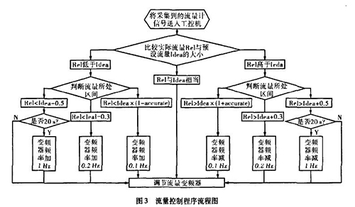 實際生產(chǎn)中流量一直在某個區(qū)域內(nèi)波動,且其動態(tài)特性不易掌握。從上面的理論中我們能夠讓誤差△£盡可能的小,這樣距我們所需要的理論值%就越接近。而減小誤差需要我們把n取的盡可能大,也就是在生產(chǎn)時間內(nèi)劃分更多的周期去調(diào)節(jié)流量。當(dāng)工控機根據(jù)一體化污水流量計傳送回來的信號發(fā)出調(diào)節(jié)變頻器工作頻率的指令后,電機調(diào)整功率到一體化污水流量計的實際測量為一個工作周期,我們知道從指令發(fā)送到實際測量值返回有一個較大的滯后,如果調(diào)節(jié)的周期時間小于流量計本身的一個工作周期,那么顯然不可能達到減小誤差的目的。利用模糊控制思想H。,在控制程序中我們把流量的波動區(qū)域劃分為±缸×Yo,Yo-t-O.3,Yo±0.5四個區(qū)域,其中缸為可調(diào)節(jié)的誤差范圍,生產(chǎn)中我們?nèi)?.015,流量區(qū)域劃分的單位均為t/h。針對不同的區(qū)域采取不同的調(diào)整方案。具體流程如圖3所示。圖中變量Rel表示實際測量的流量,變量Idea表示理論流量。