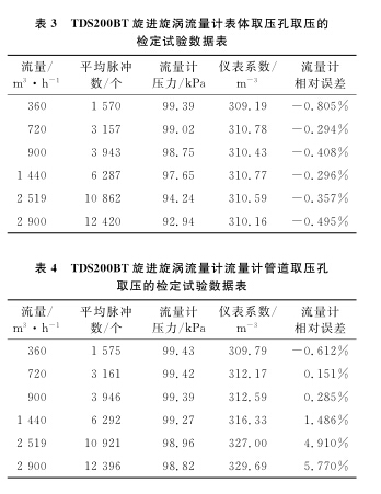 以使用廣泛的DN100B天燃?xì)饬髁坑?jì)為例,系統(tǒng)運(yùn)行時(shí)間為60s,標(biāo)準(zhǔn)裝置的滯止平均溫度為28.9℃,空間平均濕度為30%,流量計(jì)的平均溫度為28.3℃,在表體取壓孔取壓和管道取壓孔取壓的流量計(jì)檢定試驗(yàn)數(shù)據(jù)分別如表1、2所示。