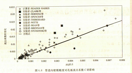 圖中所列的數(shù)據(jù)僅僅表明研究者對(duì)孔板做過(guò)這方面的研究,而不表明僅僅孔板有此影響。有的人吹噓說(shuō)某種新型差壓裝置不像孔板那樣受雷諾數(shù)影響,不受管道內(nèi)壁粗糙度影響,那是不確切的。所有管壁取壓的差壓裝置都要受到雷諾數(shù)的影響和管壁粗糙度的影響。
