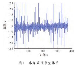 針對污泥計量表測量水煤漿時出現(xiàn)較大波動,甚至回零這一問題,特去某煤化工企業(yè)甲醇分公司進行現(xiàn)場數(shù)據(jù)采集。該公司所使用的對置式四噴嘴氣化有4個噴嘴,噴嘴管道口徑為125mm,管中水煤漿流量基本穩(wěn)定在19m³/h(流速約為0.48m/s)。每條噴嘴煤漿線上安裝了3臺污泥計量表,每臺污泥計量表由傳感器和變送器兩部分組成。選擇其中1條水煤漿管線上的1臺污泥計量表進行數(shù)據(jù)采集,因為該臺污泥計量表測量結果波動大,甚至出現(xiàn)回零的現(xiàn)象。將課題組研制的基于DSP的電磁流量變送器的信號線和勵磁線接到該電磁流量傳感器的電極和勵磁線圈上,組合成完整的污泥計量表,進行水煤漿數(shù)據(jù)采集。使用的電磁流量變送器是以TI公司DSP芯片TMS320F28335為核心,采用高頻勵磁方案,其硬件主要包括勵磁控制系統(tǒng)和信號采集處理系統(tǒng),具體的模塊有勵磁驅動模塊、信號調理采集模塊、信號處理控制模塊、人機接口模塊、通信模塊及電源管理模塊。信號調理采集模塊中的調理電路對一次儀表輸出的信號進行放大和濾波,截止頻率是2kHz,放大倍數(shù)約為230倍。通過NI公司USB-6216型號的數(shù)據(jù)采集卡進行數(shù)據(jù)采集,把調理電路的輸出端連接到數(shù)據(jù)采集卡的一個差分輸入端,并設置數(shù)據(jù)采集卡工作在差分的測量模式,設置采集卡的采樣頻率為10kHz。采集多組水煤漿信號數(shù)據(jù),每組數(shù)據(jù)的時間長度為5min。