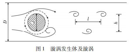 氮氣流量計是由漩渦發(fā)生體、頻率檢測器和信號轉(zhuǎn)換器等環(huán)節(jié)組成,輸出 4 ~ 20 mADC 信號或脈沖電壓信號。其測量原理是在流動的流體中的垂直流動方向安放 1 根或多根非流體型阻流體,在一定的流量范圍內(nèi),流體在阻流體兩側(cè)交替地分離、釋放出 2 串頻率正比于管道內(nèi)的平均流速、規(guī)則的、不對稱有規(guī)律的交替漩渦列,如圖 1 所示,且兩側(cè)漩渦旋轉(zhuǎn)方向相反。采用檢測元件測出漩渦頻率就可以推算出流體的流量。