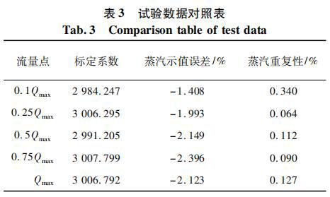 測試對象為同一臺表,DN80 口徑,帶有在空氣標(biāo)定裝置上的 5 點(diǎn)標(biāo)定系數(shù)。將管道介質(zhì)設(shè)定為過熱蒸汽,并預(yù)設(shè)溫度為 160 ℃ 和壓力 0. 4 MPa,以便儀表計算過熱蒸汽的密度。試驗(yàn)數(shù)據(jù)對照如表 3 所示。