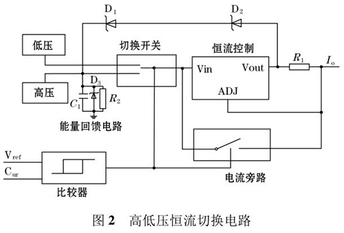 高頻勵(lì)磁電路主要由高低壓切換恒流控制電路和H 橋勵(lì)磁開關(guān)電路組成。其中高低壓切換恒流控制電路確保高壓或低壓情況,都可以通過(guò) H 橋向勵(lì)磁線圈提供恒定的電流。電路原理圖如圖 2所示。