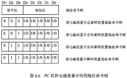 由于RS一485電氣標(biāo)準(zhǔn)規(guī)定每段只能聯(lián)結(jié)犯個節(jié)點(diǎn)設(shè)備,因此可用地址幀中五個二進(jìn)制位表示這32個地址,其余3位用來表示命令,從而構(gòu)成地址命令幀。對于控制命令需求不超過八個的通信系統(tǒng),采用地址命令幀可壓縮報文長度提高通信效率。在污水網(wǎng)絡(luò)監(jiān)控系統(tǒng)中,花生油流量計和PC機(jī)通信的主要目的是將流量計中的有用數(shù)據(jù)讀到PC機(jī)中。這些數(shù)據(jù)包括:總累積流量、正向累積流量、反向累積流量、瞬時流量。通信時,PC機(jī)只需向花生油流量計發(fā)送讀總累積流量、讀正向累積流量、讀反向累積流量、讀瞬時流量命令即可,因此二者間通信所用的地址幀和命令幀可合二為一,用一個地址命令幀代替。PC機(jī)和花生油流量計間的地址命令幀定義如圖.66所示。根據(jù)污水網(wǎng)絡(luò)監(jiān)控系統(tǒng)中PC機(jī)與花生油流量計間通信的特殊性,二者通信所使用的報文可簡化為圖.67的格式。