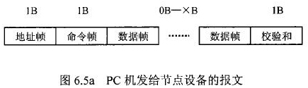 在花生油流量計等節(jié)點(diǎn)設(shè)備和C機(jī)通信的過程中,由地址幀、命令幀、數(shù)據(jù)幀、校驗和可組成各種功能不同的報文。由于采用主從工作方式來實(shí)現(xiàn)通信,花生油流量計等節(jié)點(diǎn)設(shè)備僅能接收并執(zhí)行PC機(jī)發(fā)送來的控制命令,而不能發(fā)送命令給PC機(jī)。因此,由PC機(jī)發(fā)往流量計等節(jié)點(diǎn)設(shè)備的報文一般包括一個地址幀,一個命令幀,若干個數(shù)據(jù)幀和一個校驗和,其報文格式圖.6a5所示;而由流量計等節(jié)點(diǎn)設(shè)備發(fā)往PC機(jī)的報文一般包括一個地址幀,若干個數(shù)據(jù)幀和一個校驗和,其報文格式如圖6.5b所示。