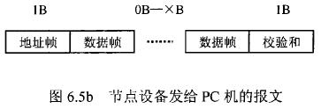 在測水流量計(jì)等節(jié)點(diǎn)設(shè)備和C機(jī)通信的過程中,由地址幀、命令幀、數(shù)據(jù)幀、校驗(yàn)和可組成各種功能不同的報(bào)文。由于采用主從工作方式來實(shí)現(xiàn)通信,測水流量計(jì)等節(jié)點(diǎn)設(shè)備僅能接收并執(zhí)行PC機(jī)發(fā)送來的控制命令,而不能發(fā)送命令給PC機(jī)。因此,由PC機(jī)發(fā)往流量計(jì)等節(jié)點(diǎn)設(shè)備的報(bào)文一般包括一個(gè)地址幀,一個(gè)命令幀,若干個(gè)數(shù)據(jù)幀和一個(gè)校驗(yàn)和,其報(bào)文格式圖.6a5所示;而由流量計(jì)等節(jié)點(diǎn)設(shè)備發(fā)往PC機(jī)的報(bào)文一般包括一個(gè)地址幀,若干個(gè)數(shù)據(jù)幀和一個(gè)校驗(yàn)和,其報(bào)文格式如圖6.5b所示。