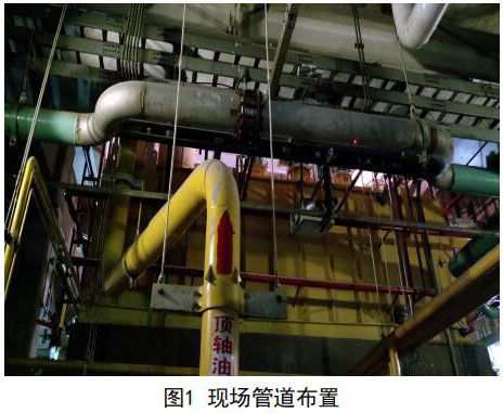 考慮兩臺機(jī)組管線布置和運(yùn)行狀態(tài)完全一致, 下面僅提供#1機(jī)組的測量分析。圖1中頂軸油管上 部水平管道為凝結(jié)水補(bǔ)水管道。