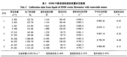 分別用精度0.5級音速噴嘴氣體標(biāo)定裝置、精度0.2級稱重法水標(biāo)定裝置對DN50口徑的不斷流渦街進(jìn)行實(shí)際標(biāo)定,其標(biāo)定數(shù)據(jù)如表1、表2所示。