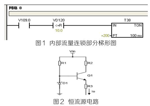(2)PLC及模塊。PLC及模塊是自動化控制系統(tǒng)主要設備,且PLC及模塊屬于高集成高精密電子設備,保持室內整潔舒適,可以提高自動化系統(tǒng)運行穩(wěn)定性。PLC及模塊硬件運行可靠,內部控制程序是其控制核心軟件,如PLC硬件出現故障或損壞一般直接更換,但原內部控制軟件無法上傳,整個控制系統(tǒng)成失控狀態(tài)。所以其內部控制程序在調試驗收合格后應及時備份并做好標記,為以后修復PLC故障提供保障。PLC系統(tǒng)的維護技術人員需掌握一定基礎PLC控制邏輯原理,對準確判斷PLC故障點有很大的幫助。例如選礦廠水泵房S7-200系列PLC自動抽水系統(tǒng)出現如下故障 :觸摸屏能控制變頻器啟動水泵抽水,但在短時間內會自動停泵,導致無法正常抽水。通過故障現象可初步判斷PLC及模塊硬件設備正常,主要由于某個變量有問題導致連鎖停機。打開備份PLC控制梯形圖程序進行相關分析,原來是高溫液體流量計瞬時流量數值做了連鎖,其在一定時間內瞬時流量不大于10m 3 /h時,自動停泵,電磁流量模擬量輸出電流值僅為4ma且無變化,確定高溫液體流量計有故障??膳R時應急維修,模擬量模塊輸入模擬電流值10ma~20ma之間一固定數值即可恢復正常運行。制作簡單恒流源電路代替高溫液體流量計輸出的模擬電流量,實現解決水泵無法正常運行的故障。