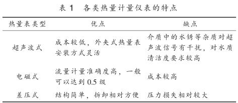 目前供熱行業(yè)內(nèi)使用的熱量計(jì)量?jī)x表按工作原理主要分為超聲波式、 電磁式、 差壓式, 其特點(diǎn)見(jiàn)表 1 。 熱量計(jì)量?jī)x表按結(jié)構(gòu)可分為一體式和分體式, 一體式熱量表將一支入口或出口溫度傳感器嵌入到流量傳感器管道中, 并配有專門的計(jì)算器進(jìn)行熱量計(jì)算; 分體式熱量表采用單獨(dú)的流量傳感器, 包括超聲波流量計(jì)、 電磁流量計(jì)、 差壓流量計(jì)、硝酸鈉流量計(jì)等, 溫度測(cè)量采用單獨(dú)的鉑電阻溫度計(jì)或溫度變送器測(cè)量供回水管道溫度, 再配備熱量積算儀進(jìn)行溫度和流量信號(hào)采集得到熱量值。