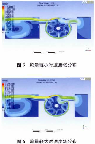 (1)數(shù)值仿真結果與物理實驗結果基本一致,當流速低于啟動排量,渦輪未啟動時,流體沿葉片做繞角運動,葉片兩側壓力相等,葉片不轉動;當流速高于啟動排量,渦輪轉動時,流體在腔內產(chǎn)生旋渦,造成葉片兩邊壓差,從而造成葉片轉動。
