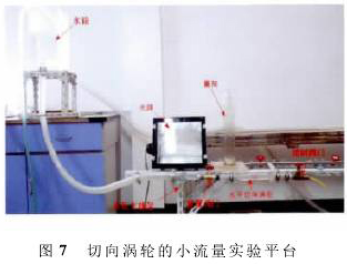 為了驗證仿真的準確性,通過室內實驗對其驗證。切向渦輪采用可視化研究平臺,整個渦輪的結構都采用亞克力板雕刻組裝而成。如圖7所示,水箱主要提供穩(wěn)定水壓,水平切向渦輪做成開口系統(tǒng)并放置在實驗支撐架上,前置閥門可控制水流,在需要更換切向渦輪的零件時可關閉,控制閥門主要是控制流經(jīng)切向渦輪的流量,流量測量仍采用傳統(tǒng)可靠的容積時間法。實驗時以染色劑作為示蹤劑,以觀察流場的分布情況。