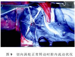 圖9記錄的是切向渦輪正常轉動時的流場,圖9中水從左向右流動,實驗時水速較快(1m3/d),渦輪葉片順時針轉動。水速變大后,擾動變大,不再是無旋繞角流動,腔體1中流體形成一個運動的旋渦,導致腔內壓強分布不再對稱,產(chǎn)生壓差,致使渦輪葉片轉動,旋渦在隨葉片運動到腔體2中時逐漸耗散消失。數(shù)值仿真的計算結果與物理實驗的結果基本一致。