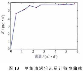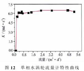 可以看出,渦輪啟動后*先進入一個非線性段,在非線性相應段,K值隨著流量增加而增大;當流量比較大(單相水超過0.5m3/d,單相油超過1m3/d)時,渦輪進入線性段,在線性響應段,K值達到峰值,有相對較小的波動。