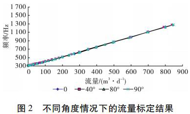 為了考察井眼斜度變化對硫酸銅流量計(jì)測量流量的影響,開展了非集流硫酸銅流量計(jì)在不同斜度情況下的流量測量模擬實(shí)驗(yàn)。模擬實(shí)驗(yàn)在大慶油田多相流實(shí)驗(yàn)室進(jìn)行,儀器外徑 38 mm,模擬井筒內(nèi)徑為 124 mm,實(shí)驗(yàn)介質(zhì)是水,傾斜角度分別為 0°、40°、80°和 90°( 水平) ,流量范圍為 5 ~ 850 m3 /d。實(shí)驗(yàn)結(jié)果表明,在儀器居中條件下,井眼斜度變化對硫酸銅流量計(jì)的儀表常數(shù)沒有影響,滿量程誤差不大于 4% ,因此可以應(yīng)用硫酸銅流量計(jì)進(jìn)行水平井注水剖面測量。不同角度情況下的實(shí)驗(yàn)結(jié)果如圖 2 所示。