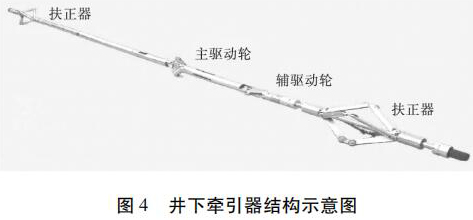 水平井注水井注入剖面測井工藝原理如圖 3 所示。在垂直井段,儀器在重力作用下可以通過注入管柱下入到井內(nèi),注入管柱下端須裝有喇叭口,且喇叭口應(yīng)在造斜點(diǎn)以上,保證測井完成后儀器順利起出,不發(fā)生卡儀器問題。儀器通過喇叭口以后在重力作用下繼續(xù)向下移動,當(dāng)儀器不能靠重力下移時,啟動牽引器,利用牽引器將儀器推送到井底,上提電纜過程中進(jìn)行測井。