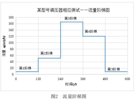 該測試主要利用實(shí)驗(yàn)室測試條件,模擬客戶現(xiàn)場使用情況。其主要測試內(nèi)容包括:測試分體式電磁流量計在+23℃,-30℃和-40℃三種溫度下,分體式電磁流量計出口壓力分別在2.1kPa和30kPa時,流量分別從*1階梯到*5階梯時的響應(yīng)速度,客戶所提供的流量階梯如圖2所示。橫軸表示下游球閥開啟動作時間,縱軸表示分體式電磁流量計下游需要的流量q。
