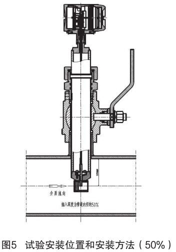 對插入式渦街流量計和插入式電磁流量計的結(jié)構(gòu)原理進(jìn)行分析,插入式電磁流量計的信號采集點在標(biāo)校管道內(nèi)12.5% 為宜,因它屬電磁類流量計,而流量計是根據(jù)“卡門渦街”原理進(jìn)行測量管道內(nèi)流量,根據(jù)標(biāo)校管道內(nèi)層流和湍流的分析,以及流量計獨特的探頭結(jié)構(gòu)形式,確定煙氣流量計的插入深度為標(biāo)校管道內(nèi) 50%,試驗安裝位置和安裝方法如圖 5 所示。