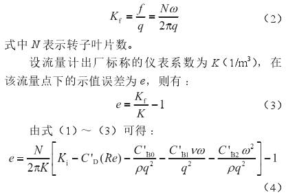 式中q表示體積流量,m3/s;ν表示介質的運動黏度,m2/s;雷諾數(shù)Re=4q/(πdν);d表示流量計口徑,m;ρ表示介質的密度,kg/m3;C'D、C'B0、C'B1和C'B2分別表示4個待定系數(shù),在某個流量點下標定出的儀表系數(shù)(Kf,表示單位體積流體通過流量計時,流量計輸出的脈沖數(shù),1/m3)和轉子葉片頻率(f,s-1)的關系為: