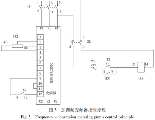 STD - Ⅲ型浮選工藝參數(shù)自動測控系統(tǒng)通過雙膜盒差壓計測量原礦漿濃度; 采用管道式流量計測量原礦漿流量,由 PLC 計算出入浮干煤泥量和藥劑的瞬時添加量,用變頻式計量泵完成浮選藥劑的添加。通過上位機還可以打印小時、班、天及月的運行數(shù)據(jù),更加有利于生產(chǎn)管理及技術分析,藥劑自動原理如圖 2 所示,k1、k2、k3 是計算修正參數(shù)。以 PID 算法為核心,通過優(yōu)化控制程序計算出藥劑給定量,在捕收劑和起泡劑管道上分別安裝藥劑測量裝置,用于檢測藥劑的添加量。當藥劑測量值小于藥劑給定量時,PID 輸出增大,反之則減小。加藥泵變頻器控制原理如圖 3 所示。
