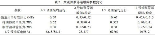 通過(guò)內(nèi)部旁通將冷油與熱油混合,經(jīng)過(guò)銅粉- 煤油 - 蠟感溫元件控制冷熱油混合比例,將油溫調(diào)節(jié)到 49 ℃。一臺(tái)一體式電磁流量計(jì)穩(wěn)定運(yùn)行,油泵出口母管壓力 0. 5 MPa,潤(rùn)滑油母管壓力 0. 24 MPa,均屬于正常情況,而兩臺(tái)交流油泵并列運(yùn)行時(shí),停運(yùn)其中一臺(tái)交流油泵瞬間會(huì)觸發(fā)電磁流量計(jì)出口母管壓力開(kāi)關(guān)動(dòng)作,說(shuō)明停運(yùn)瞬間油壓發(fā)生波動(dòng),且油泵出口母管油壓波動(dòng)至小于 0. 45 MPa。正常運(yùn)行時(shí)電磁流量計(jì)出口油溫 71.5 ℃,冷油器出口溫度45 ℃,混合后潤(rùn)滑油母管溫度52.5 ℃,由能量守恒定律可知,經(jīng)過(guò)冷油器的油量/不經(jīng)冷油器的油量= ( 71.5-52.5) ÷ ( 52.5- 45) = 2. 53,說(shuō)明有 70% 左右的油量經(jīng)過(guò)冷油器。當(dāng) 2 臺(tái)一體式電磁流量計(jì)運(yùn)行時(shí)油量大于單泵運(yùn)行,其中一臺(tái)電磁流量計(jì)瞬間停運(yùn)時(shí)油量減少,尤其是經(jīng)過(guò)冷油器的油量大量減少,油量在溫控閥二次分配過(guò)程中出現(xiàn)調(diào)節(jié)異常,導(dǎo)致油壓過(guò)大波動(dòng)。為檢驗(yàn)溫控閥工作情況,保持 1 號(hào)、2 號(hào)交流油泵運(yùn)行,選取機(jī)組正常帶負(fù)荷運(yùn)行時(shí)油溫 52 ℃,分別停運(yùn) 1、2 號(hào)交流油泵,觀察 1、2 號(hào)交流油泵停運(yùn)瞬間油泵出口母管壓力波動(dòng)情況,試驗(yàn)各參數(shù)變化見(jiàn)表 2。