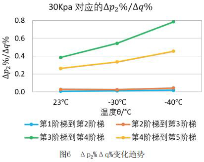 為了更直觀嚴謹?shù)膶Ρ让總€階段響應(yīng)速度的不同,對原始數(shù)據(jù)進行處理,得到如下表格2和表格3。將△p2%/△q%作為響應(yīng)速度的直觀量化表達,若△p2%/△q%的值大,說明單位流量變化照成的出口壓力變化大,即說明電磁流量計響應(yīng)相對較慢,反之亦然。