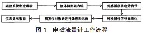 智能渦輪流量計的產(chǎn)生主要是基于法拉*電磁感應(yīng)定律。在智能渦輪流量計的應(yīng)用中,磁路系統(tǒng)會在流量計運行過程中逐步出現(xiàn)直流磁場與交流磁場,該磁場的產(chǎn)生為后期的測量提供了良好的前提條件,營造了測量所需的磁場環(huán)境,因此,在智能渦輪流量計應(yīng)用時,一旦被測液體在導(dǎo)管中經(jīng)過該磁場環(huán)境時,必然會產(chǎn)生一定的切割磁力線運動,在這種情況下,電極傳感器就會發(fā)揮其作用,將導(dǎo)管內(nèi)的流量轉(zhuǎn)換為感應(yīng)電勢信號,隨后此轉(zhuǎn)換形成的信號逐步被傳遞給轉(zhuǎn)換器。而轉(zhuǎn)換器更是可以將所獲得的流量信號等加以處理,通過分析、對比等,轉(zhuǎn)換器會將該信號變?yōu)闃?biāo)準(zhǔn)信號,隨后將該信號輸出給積算儀,進(jìn)一步進(jìn)行信號的處理,這些處理以后的信號*終會在智能渦輪流量計的儀表中顯示,呈現(xiàn)*終的流量測量結(jié)果,其基本的流程如圖 1 所示。