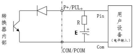 PUL+/ P+、ALM+(AH)、ALM-(AL)和 PDIR(FDIR)均為集電極開路(OC 門)輸出(參閱圖 3.6b、3.6d,用戶接線時必須參照如下電路外接電源和負(fù)載: