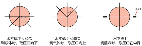 2、測(cè)氣體時(shí),為防止液體進(jìn)入導(dǎo)壓管,取壓口方向應(yīng)處于水平線上偏45度的位置以內(nèi),正、負(fù)取壓口在同一水平面上。