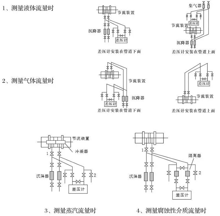 根據(jù)被測(cè)介質(zhì)的性質(zhì)、節(jié)流裝置與差壓計(jì)的相對(duì)位置,差壓信號(hào)管路可有以下幾種安裝方式:
