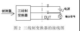 三線制變換器的接線圖如圖 2 所示,電流輸出系統(tǒng)除了兩根電流傳輸線以外,還有一根電源線向變壓器提供電源。三線制就是電源正端用一根線,信號輸出正端用一根線,電源負端和信號負端共用一根線。其供電大多為 DC 24V , 輸出信號有 DC4-20mA ,負載電阻為 250Ω 或者 DC0-10mA ,負載電阻為 0-1.5kΩ ;有的還有 mA 和 mV 信號,但負載電阻或輸入電阻,因輸出電路形式不同而數(shù)值有所不同。