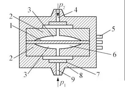 1—金屬膜片(動極);2—凹玻璃圓盤;3—金屬鍍層(定極);4—低壓側(cè)導壓口;5—輸出端子;6—空腔;7—過濾器;8—殼體;9—高壓側(cè)導壓口