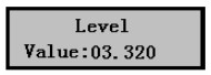 1)儀表上電,儀表進(jìn)入測量,液晶顯示液位數(shù)值,如右圖,而實測液位為3.320m,下面介紹標(biāo)定方法。