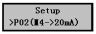 1)在儀表正常工作時按擊Mode鍵進(jìn)入?yún)?shù)設(shè)置菜單后按擊▼鍵選擇P02(4~20mA)設(shè)置菜單,如右圖。