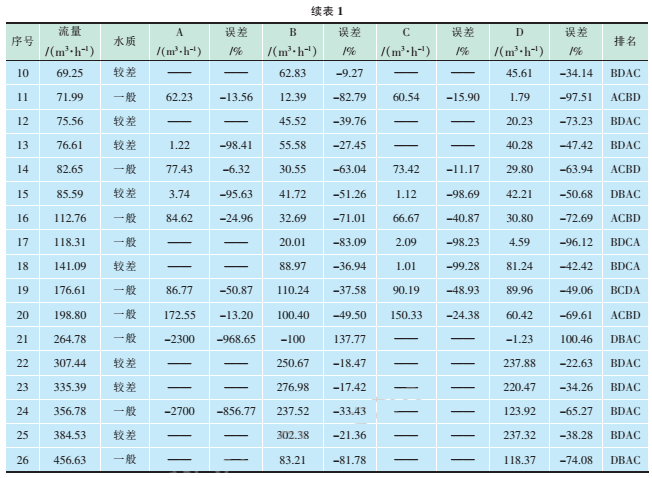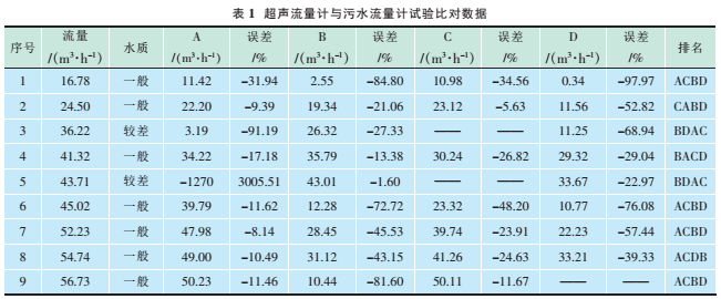 試驗數(shù)據(jù)見表1,其中流量表示污水流量計60min內的累計流量;A、B、C、D分別為4個型號的超聲波流量計在60min內的累計流量;排名為與同一臺污水流量計比對的4臺超聲波流量計的誤差按從小到大的順序。