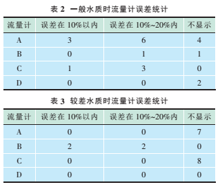 從表2和表3發(fā)現(xiàn),試驗中水質一般(濁度<50mg/L)的情況下,時差法流量計的有效數(shù)據(jù)(誤差<20%)為13個,占總試驗數(shù)據(jù)(32個)的40.63%;不顯示的情況有4個,占總試驗數(shù)據(jù)(32個)12.5%的。水質較差(濁度≥50mg/L)的情況下,多普勒法流量計的有效數(shù)據(jù)(誤差<20%)為4個,占總試驗數(shù)據(jù)(32個)的12.5%;該類型流量計不存在不顯示的情況。