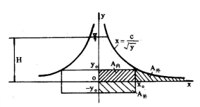 即縱坐標(biāo)y值趨近于零時,橫坐標(biāo)x值趨近無窮大。這在堰板的實際制作上是無法實現(xiàn)的。若將堰口曲線的*低縱坐標(biāo)取為yo,在yo一下至(-yo)增開一矩形,即高為2yo,寬為2x。的補(bǔ)償孔,從數(shù)學(xué)上可以證明,坐標(biāo)原點以下所增大的矩形面積(A補(bǔ))正好等于舍去的曲邊面積(A補(bǔ))。由圖3可知